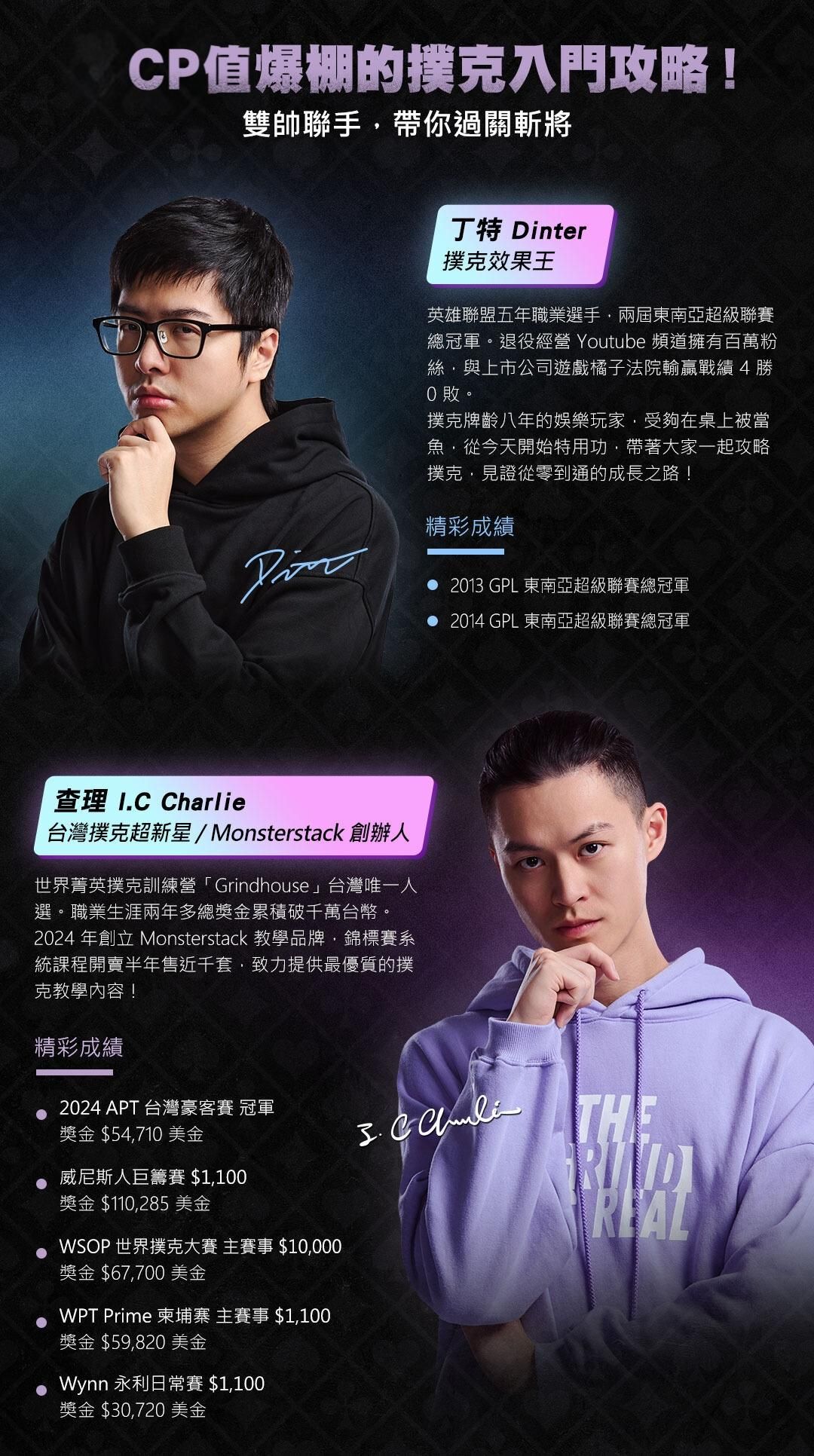 Fedor Holz 欽點世界菁英撲克訓練營「Grindhouse3」台灣唯一人選。職業撲克生涯兩年,已累積破千萬台幣的總獎金,2023 單年錦標賽淨獲利 600 萬台幣。台灣土生土長,但擁有世界頂尖撲克教學資源,也是將國外頂尖撲克教學內容帶進亞洲的第一人!